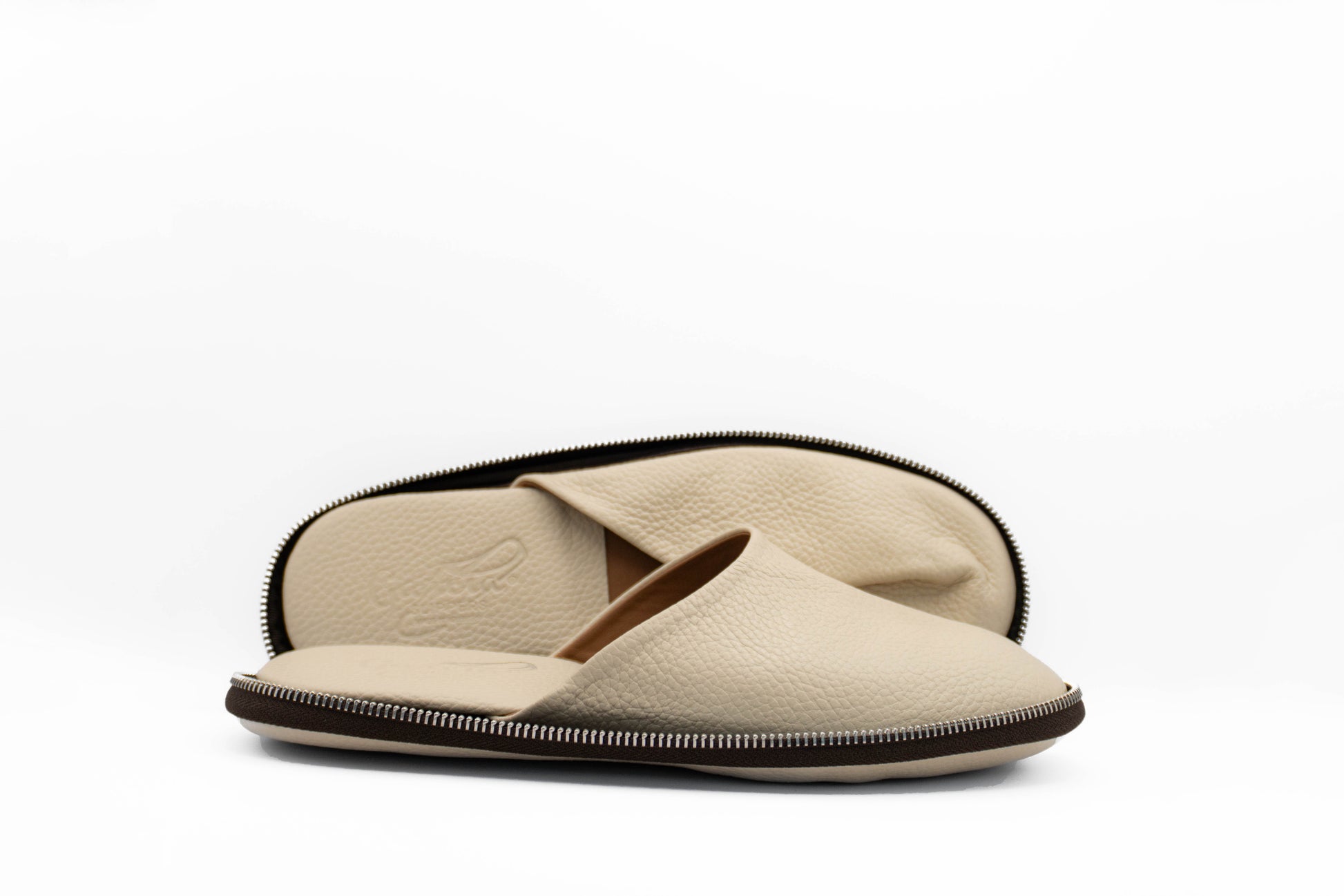 Soft, flexible sole for immediate comfort anywhere. Lightweight and foldable, making them easy to pack for any trip. Minimalist design in neutral tones that suits every travel style. Perfect for use in hotels, during flights, or moments of rest on the go. Includes a matching leather zip case for easy and practical storage.